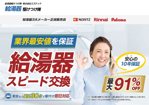 給湯器3大メーカー(ノーリツ・リンナイ・パロマ)に対応するほか、最大91%OFFの激安になる場合も!